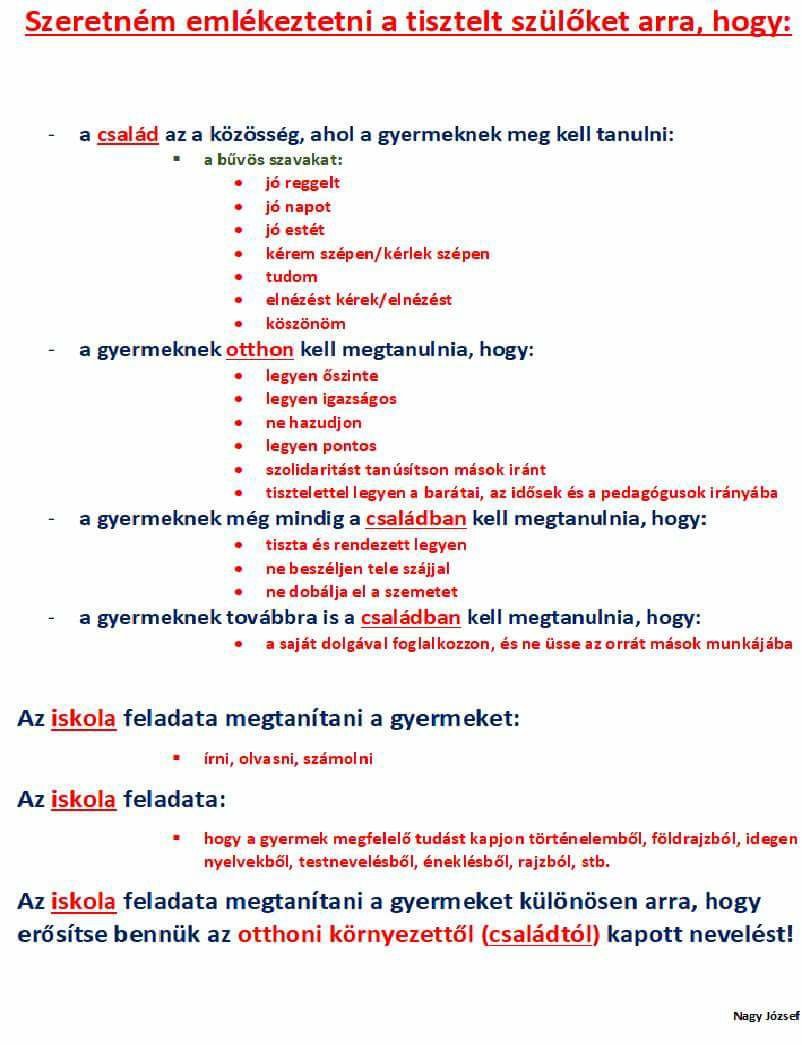 A szülőnek lenne elsődlegesen dolga, hogy az életre nevelje gyermekeit. Csak valahogyan valami mindig hibádzik a nevelés körül. A szülők szeretnek ujjal mutogatni az oktatási vagy gyermekfelügyelettel foglalkozó intézményekre, hogy a nevelés az ő feladatuk is lenne. Persze a pedagógusok pedig visszamutogatnak, hogy ez bizony kizárólagosan a szülő feladata. És ennek az oda-vissza hárításnak nincs más vesztese, mint a gyermektársadalom, akikből felnőve a jövőnk lesz. Lehet sírni, kritizálni őket, hogy majd hogyan fognak rólunk idősebbekről idővel gondoskodni.